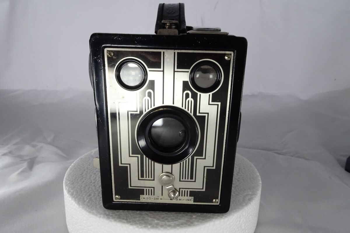 Il s’agit d’un Kodak fabriqué aux Etats-Unis et en Angleterre mais, s’ils ont la même dénomination, il sont singulièrement différents, tant dans la construction que dans la façade art déco. Par contre, tout les deux prendront huit photos de 6x9cm sur un film de 620 (ou un 120 modifié).